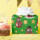 Christmas wrapping paper with an illustration of a cute smiling happy black baby girl or boy, the baby is wearing red and white clothes and holding a present; with editable text template for your name or message, Christmas holidays design with a seamless green background with stars