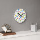 Cute Christmas balls and gifts pattern wall clock. A pattern of Christmas balls and gifts adorn this clock. Colours: red, green ,yellow, grey and mauve.