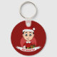 Keychain with an illustration of a cute smiling happy black-haired boy, he is wearing red and white Santa Claus costume and holding a present; with editable text template for your name or message, Christmas holidays design with a red background
