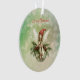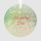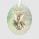 A cute fairy wearing a red cap sits on a green Christmas ornament decorated with holly leaves and berries while snowflakes swirl around her. The words “Merry Christmas” can easily be changed to any greeting you prefer and the back can be personalized as well.