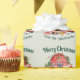 This custom Christmas holiday wrapping paper features a cute watercolor cartoon illustration of a farm. Little baby farm animals are dressed in Santa hats outside of a country farmhouse. The background is a light sage green colour.