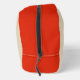 This awesome cosmetic bag features a graphic image of a cute gingerbread couple. The gingerbread man has green and red buttons and green and red fringed trousers. The gingerbread lady has pretty eyelashes and wears red lipstick. She has a green and red fringed skirt and top on. Both have a big smile. There is a gingerbread heart above the couple showing their love for each other. There is white writing inside the heart that says "made for eachother". This would make a lovely gift for a couple at Christmas.