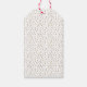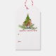 A Christmas gift tag features a cute gnome standing on a bed of pine needles in front of his cozy home. A glittery gold star is atop his tree. Below in festive red retro-style calligraphy is "Merry Christmas" and below is preprinted "to" and "from" text. The reverse is a pattern of tiny gold stars. (The glittery gold details are digital print only).