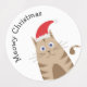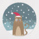 Santa claus kitten between snowflakes. Cute cartoon pet cat in christmas landscape. Meowy Christmas funny kitty