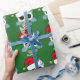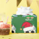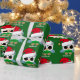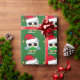Adorable animal Christmas gift featuring a beautiful big-eyed owl in green and red wearing a Santa hat. A very whimsical holiday kids wrapping paper personalized with their name.