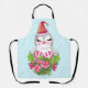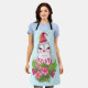 An apron with a cute and whimisical design featuring an adorable penguin wearing a red santa hat. Standing behind a bouquet of flowers with pink and white striped candy canes.