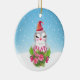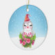 Christmas ornament with a cute and whimisical design featuring an adorable penguin wearing a red santa hat. Standing behind a bouquet of flowers with pink and white striped candy canes. A snowy winter background with snowflakes falling.