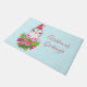 A door mat with a cute and whimisical design featuring an adorable penguin wearing a red santa hat. Standing behind a bouquet of flowers with pink and white striped candy canes.