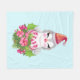A blanket with a cute and whimisical design featuring an adorable penguin wearing a red santa hat. Standing behind a bouquet of flowers with pink and white striped candy canes.