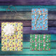 These gift wrapping paper sheets feature a cute pattern of Christmas penguins wearing Santa hats and scarves, with a snowglobe and a Christmas tree. The patterns are set against three different colour backgrounds - pale yellow, sky blue, and fresh green. Wrap up your gifts with some cute North Pole critters for a special touch during the holidays.
