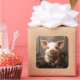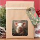 Sticker featuring a digital oil painting of a cute pig surrounded by pine cones and pine tree garland with Christmas lights. The wood background adds a rustic vibe to the artwork.