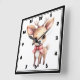 A clock with an illustration of an adorable baby deer. Big eyes big ears with a large head and little brown antlers. Wearing a big red bow.