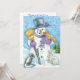 Vintage illustration Merry Christmas holiday design featuring adorable cartoon forest creatures building a snowman in winter. The snowman is holding a broom, wearing a scarf and has a top hat. A squirrel is adding a lump of coal for his mouth, a skunk is adding more snow to his body, a rabbit is rolling a snowball while a red bird sits on the brim of his hat.