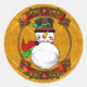 A cute Christmas pattern of a cartoon snowman surrounded by holly set against a festive golden background.