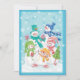 Vintage illustration Merry Christmas holiday design featuring an adorable cartoon happy snowman family with mom, dad and the snow children. Everyone is smiling and wearing a scarf and holding Christmas presents and a Christmas tree. It is snowing with large snowflakes falling. Their scarves and hats are all different colours, red, yellow, green and blues.