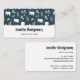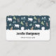 A business card with a whimsical festive pattern. Polar bears, reindeers, trees. foxes, and snowflakes. On a dark green background.