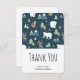 Flat thank You card with a whimsical festive pattern. Polar bears, reindeers, trees. foxes, and snowflakes. On a dark green background.