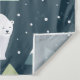 Tapestry with a whimsical festive pattern. Polar bears, reindeers, trees. foxes, and snowflakes. On a dark green background.