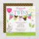 Start your twins baby shower off right with our sweet baby bodysuit clotheslines baby shower invitation for a girl boy twin birth combination. Our multiple baby shower invitation for a girl & boy twin features a cute bunny sitting on a lawn with a pink & yellow flowers with two clotheslines with blue, pink, lime green & brown baby bodysuits. Coordinating brown & lime green polka dots back. Visit our shop for matching thank you note cards, stickers and postage stamps Baby bodysuits are © Erin Bradley Designs