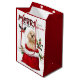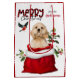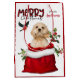 The image on both front and back of this Christmas gift bag is an image of a cute blonde Cocker Spaniel dog peeking out from a Holiday gift bag. Behind him is a sprig of holly and red berries. A red and black bullfinch bird is about to land. Stylized red and black buffalo plaid text says MERRY CHRISTMAS". Your own signature is in two fields for you to customize. Be sure to see the matching products, including ornaments, in our store.