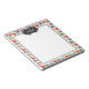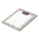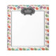 Personalized notepad with a cute pattern of macarons in many different colors with a faint polka dot pattern behind. A white frame in the center to write inside with a fancy vintage-looking black and white decorative frame at the top with yourpersonalized text inside.