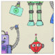 Cute colorful robots on yellow background