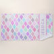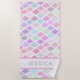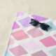 Be ready to hit the beach for some fun in the sun with this cute modern abstract geometric style beach towel. This design features a cool geometric pattern in pastel shades of pink, blue, green, and purple in diamond shapes against a white background. Personalize this towel for the beach or swimming with the name of your choice. The font and colour of the text are customizable.