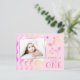 Cute birthday party card for the 1st birthday with a photo. Personalize this birthday invite with a child`s name, age and baby`s photo on the front side. Personalize all the data on the back side of the invitation. The design has rainbow waves in pink, violet and yellow colours. The pink makes this great as a party invite for a girl's 1st birthday.