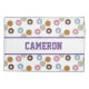 This cute and stylish pillow case features a tiled pattern of illustrated colourful doughnuts. Five separate doughnuts are printed with pink, white, orange, baby blue, and brown chocolate frostings. The yummy looking frosted doughnuts have different sprinkles on each. A sample name is printed across the centre which you can personalize to include your own name or custom text.