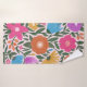This cute, colourful bath towel set features a bath towel containing a hand drawn floral design in magenta / fuchsia pink, orange, golden yellow, purple, blue, and green over a custom colour background (shown in light pink). The floral design's art style is almost chalk - like / pastels. Text templates are included on the hand towel and washcloth (monogram and name), making this a great gift! The background colours on both can be customized to any colour you'd like.
