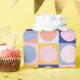 A sweet, playful geometric pattern of circle and square shapes in a cute colour palette of blue, yellow, coral, periwinkle, and pink.