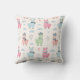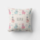 This cute, personalized kids' throw pillow features cartoon llamas in soft pastel colours surrounded by stars, hearts, clouds, and cactus sketches, all set against a creamy off-white background.