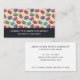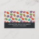 Business cards with a cute pattern of macarons in many different colours with a faint polka dot pattern behind. A black grey border with your name and title written across. Personalized info on the back.
