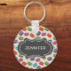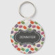 Personalized keychain with a cute pattern of macarons in many different colours with a faint polka dot pattern behind. A fancy vintage-looking grey and white decorative frame with your text inside.