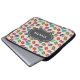 Personalized laptop sleeve with a cute pattern of macarons in many different colours with a faint polka dot pattern behind.
