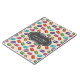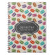 A personalized notebook with a cute pattern of macarons in many different colours with a faint polka dot pattern behind. A fancy vintage-looking grey and white decorative frame with your text inside.