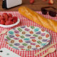 Paper plates with a cute pattern of macarons in many different colours with a faint polka dot pattern behind.