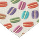 A table runner with a cute pattern of macarons in many different colours with a faint polka dot pattern behind.
