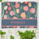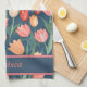 Modern and trendy Ai Generated beautiful and colourful red pink peach yellow tulips flowers seamless pattern on navy blue background kitchen towel designs. Personalised name any occasional unique gift for her who loves colourful Tulips.