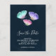 Save the date postcard with a delicate nature design. 3 watercolor butterflies, painted pink, purple and green. Dark blue watercolor background.