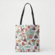Customizable name and monogram tote bag with cute whimsical painted ladybugs, plants, flowers, and red mushrooms with faux glitter effect.