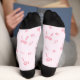 This charming pair of socks features a delicate coquette design, perfect for those who appreciate a touch of feminine flair in their fashion attire. The pattern showcases an intricate composition of delicate bows, blooming flowers, and leaf flourishes, all intricately detailed and set against a soft background. The hues are various tones of pink, ranging from subtle blush to deeper rose shades, creating a harmonious and inviting colour palette.