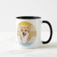 A portrait of an adorable Corgi Dog is the feature on this mug. The image is placed on a retro, slightly distressed gold, tan, and blue stripe sunset background, and printed twice on the mug. Your name is in black script between the images.