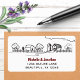 This address label design features a charming line drawing of a country farm all in black, white and red.