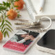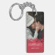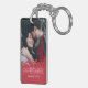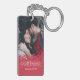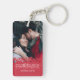 Personalized couples keychain featuring 2 different photos of you and your partner, a modern red love heart design, the saying "i will love you forever", and your names.