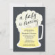 Modern fun a baby is brewing couples baby shower featuring a beer mug filled with yellow beer set on a popular black chalkboard background for a gender neutral baby shower.