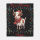 Snuggle up in holiday cheer with this adorable fleece blanket featuring a cute cow dressed in festive clothes. The cheerful cow is surrounded by Christmas lights, adding a warm and whimsical glow to the scene. This blanket is perfect for chilly winter nights bringing a touch of playful Christmas magic to your home decor. Whether draped over a couch or used for cuddling by the fire, it's a delightful addition to any holiday season. You can edit the text and put a favourite colour background.