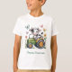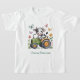 A whimsical cartoon illustration of a cute cartoon cow driving a vintage green tractor. The cow has black and white spots, large round eyes with rosy cheeks, and a small black tail. The tractor is painted in military green with yellow wheels and black rubber tires. The scene is decorated with colourful butterflies - a blue butterfly, a pink butterfly, a purple butterfly, and a yellow butterfly flying around the top of the image. There are pink daisies with brown centres and green leaves scattered throughout the bottom of the image. The background is white, creating a clean, cheerful farm scene. The cow has a happy expression and is positioned in the centre of the image, sitting on the tractor's seat. The illustration has a soft, watercolor-like quality with clean lines and gentle shading.