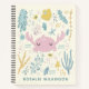 This cute custom notebook features a whimsical illustration of a crab surrounded by shells, flora, starfish, and more, in a pretty pastel colour palette of pink, blue, and yellow. Personalize it with your name. Great gift idea!