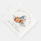 These baby shower napkins feature a cute Halloween baby theme. A little crochet style ghost is pictured in the centre holding a piece of candy corn and standing beside a crocheted pumpkin. A bouquet of baby's breath is placed below the little stuffies. The phrase, "a little boo is almost due" is printed at the top in an elegant script font. The sage green font is suitable for a boy, girl, or gender neutral baby shower.